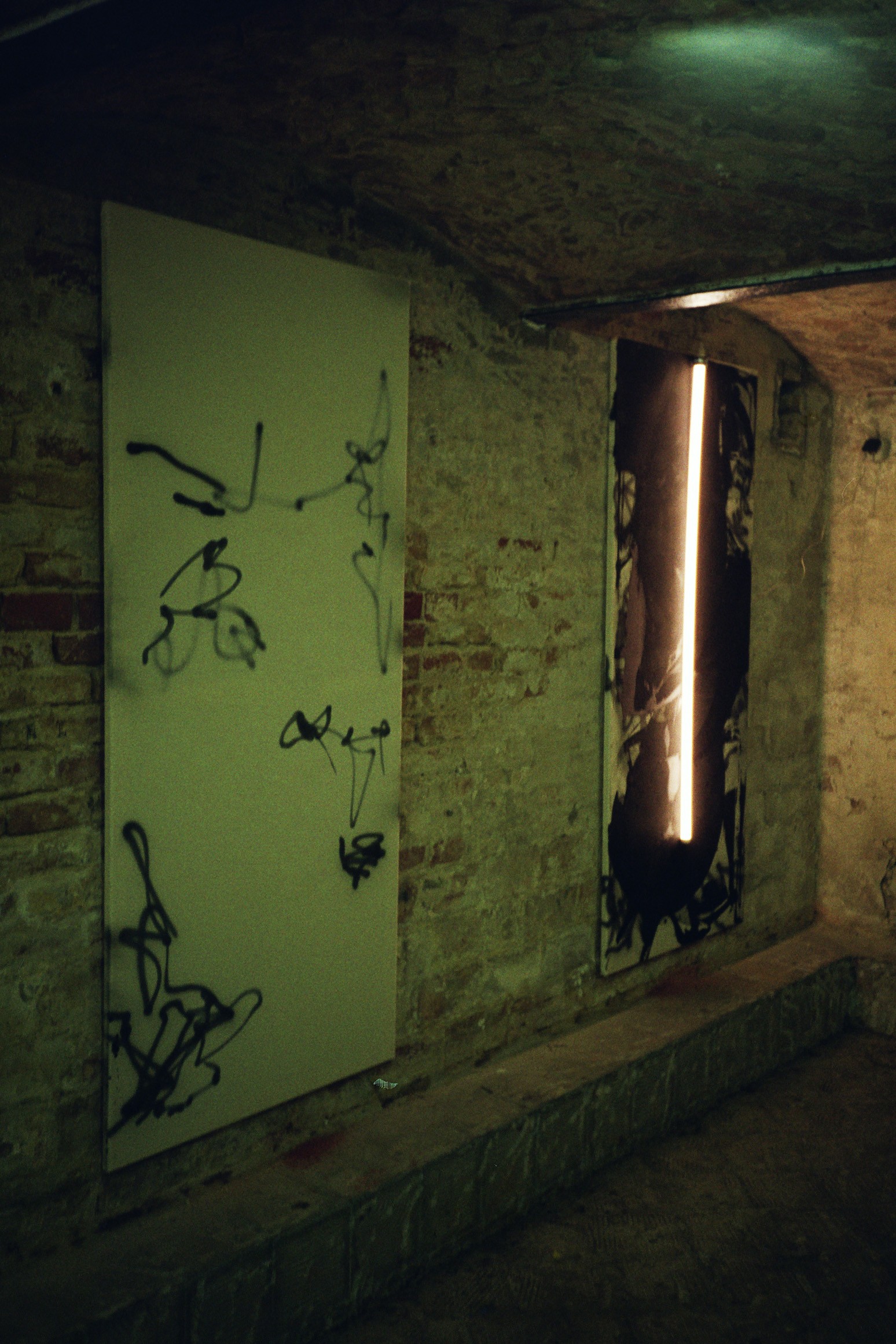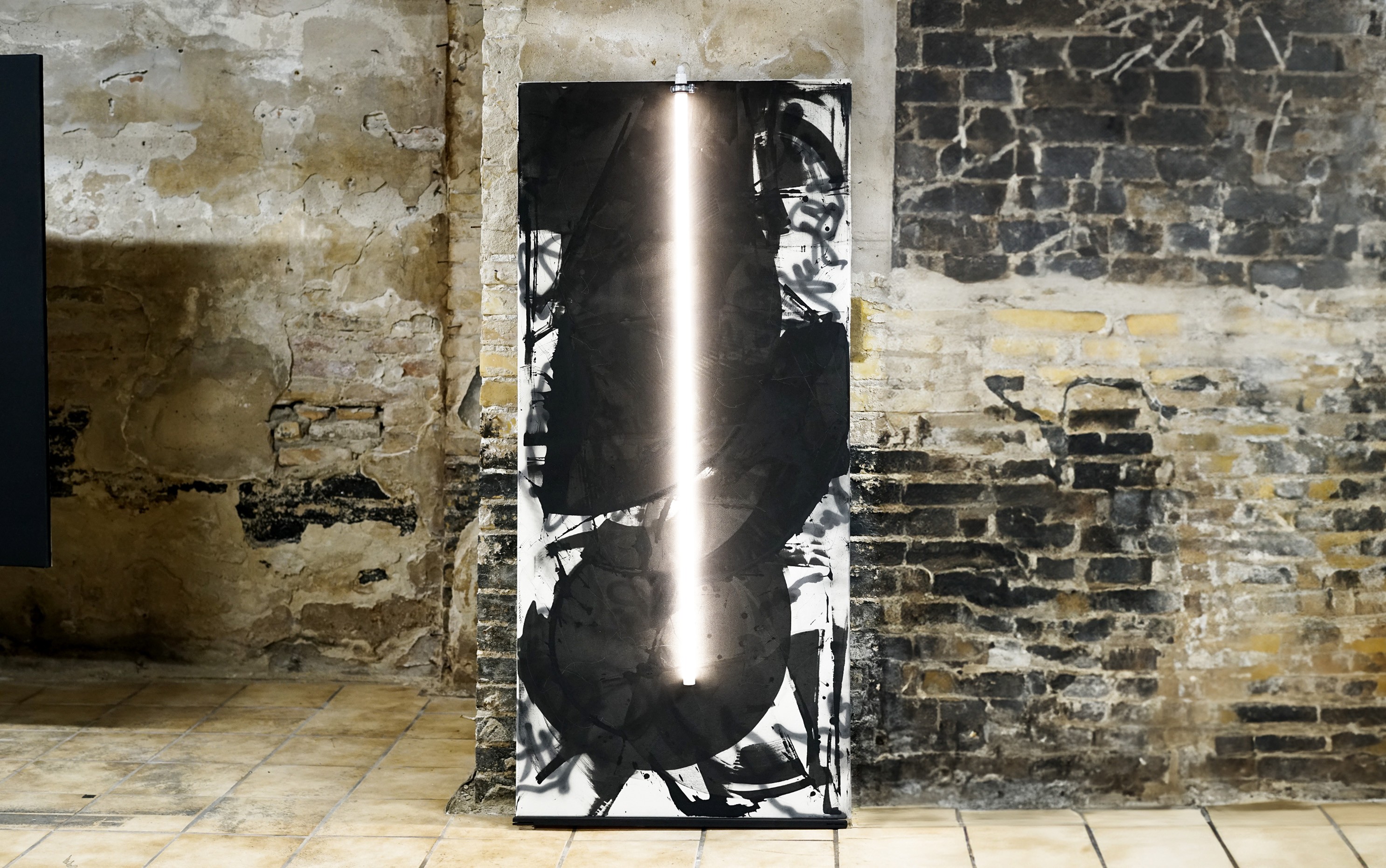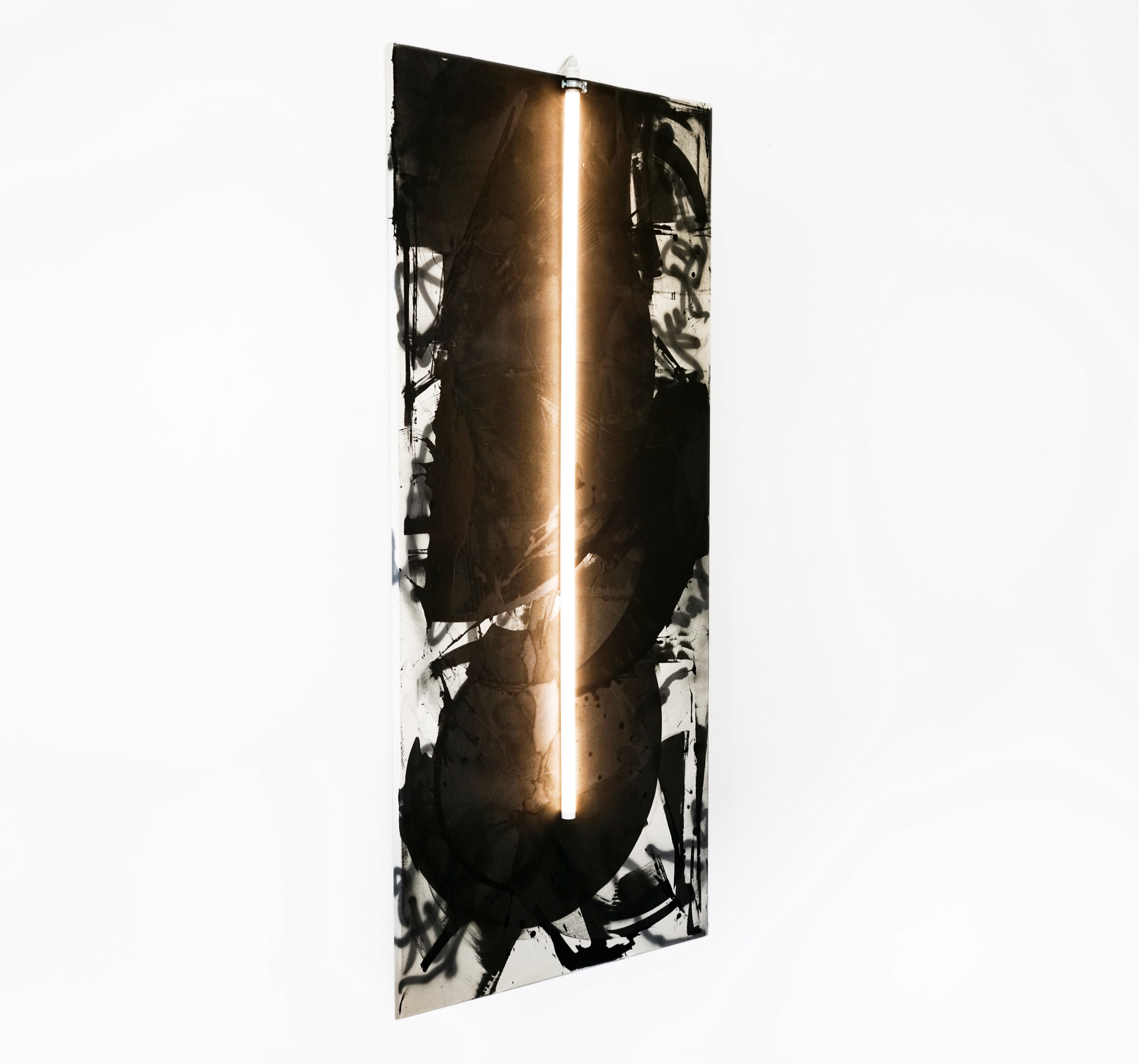AS LIGHT AS AN INSTINCT (2024) — acrylic, SPRAY PAINT, LED LIGHT TUBE on COTTON canvas, 180 x 80 cm.