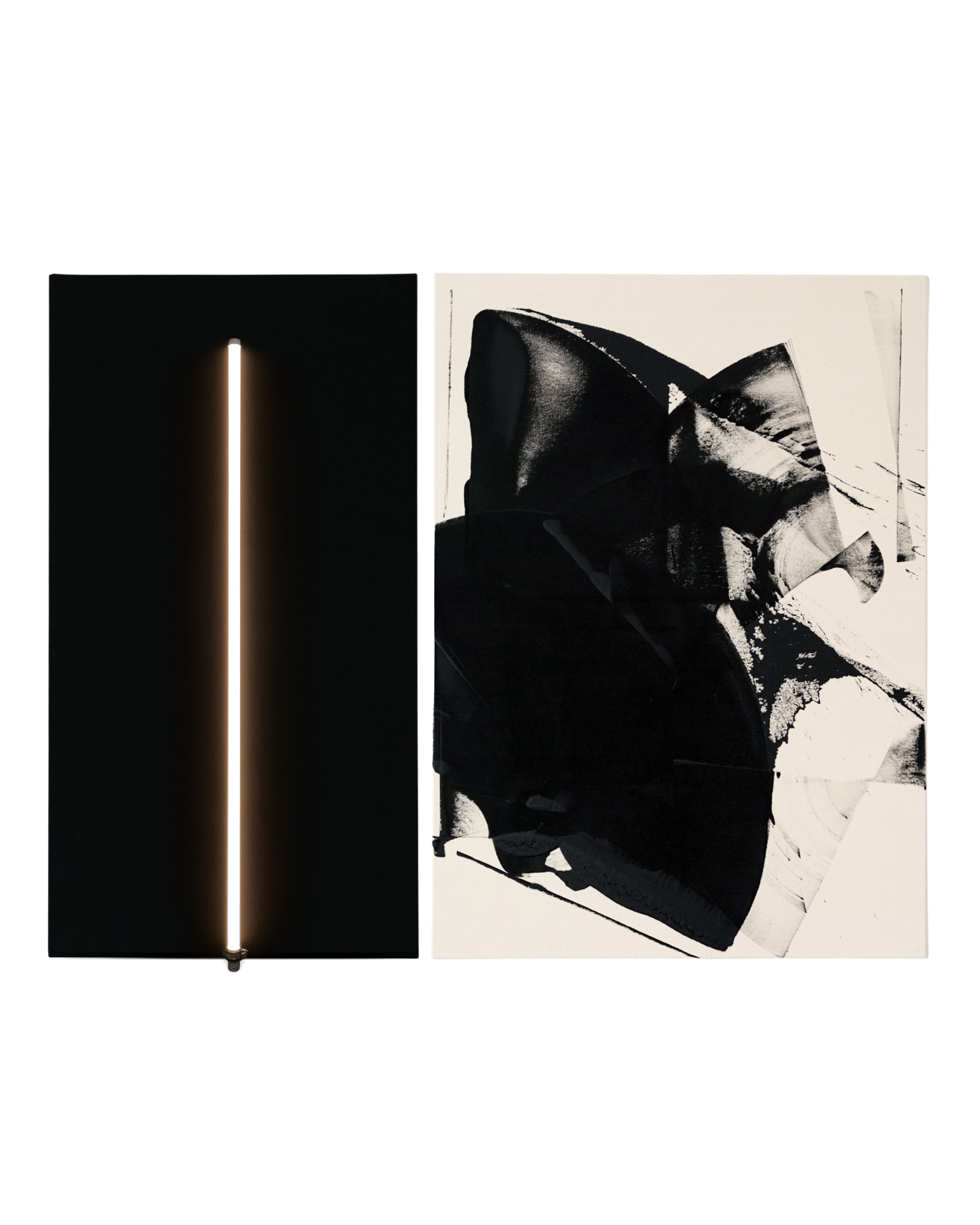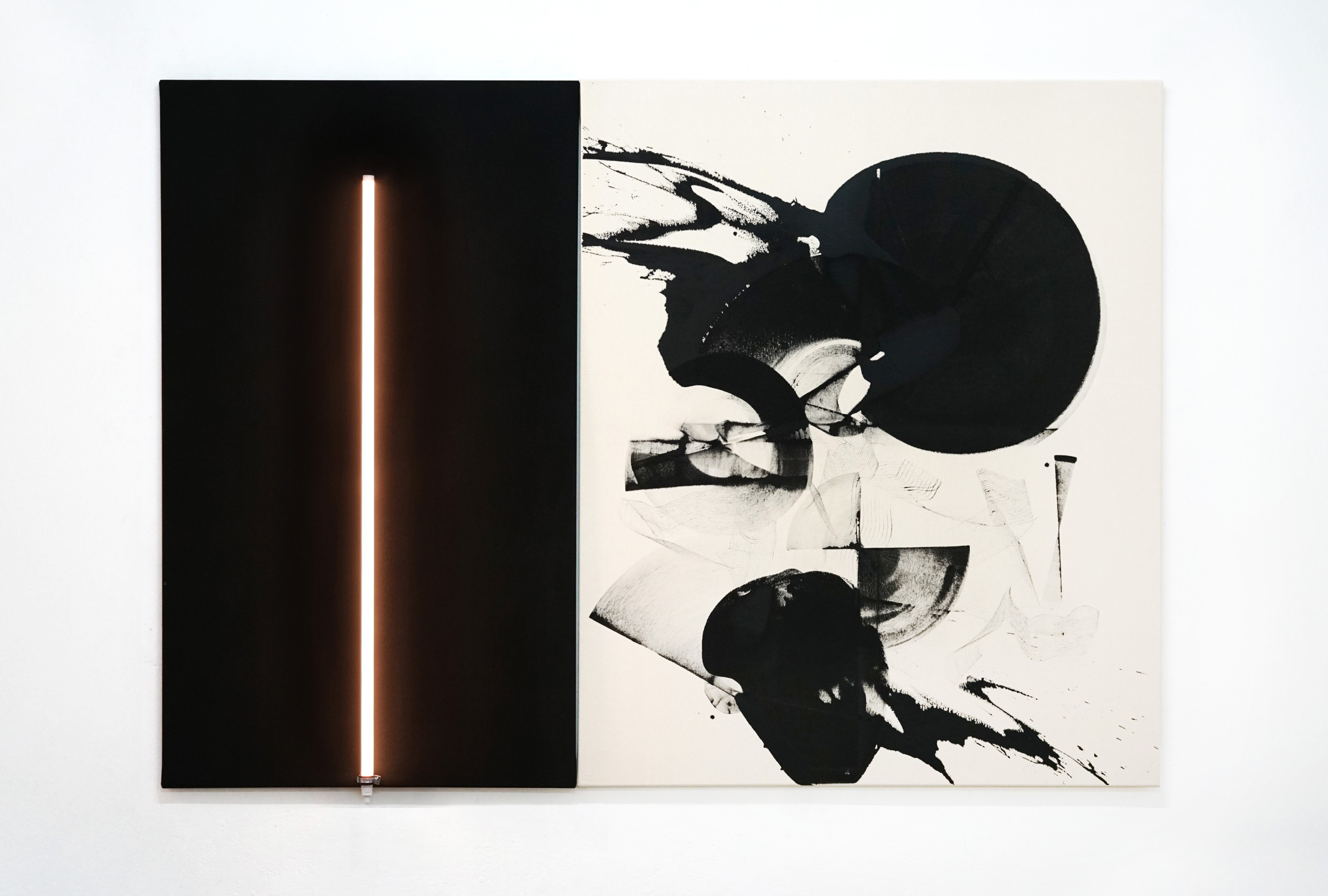 THE ELEMENT (2023) — Acrylic on cotton canvas, LED tube light, hardware. 170 x 240 cm diptych.